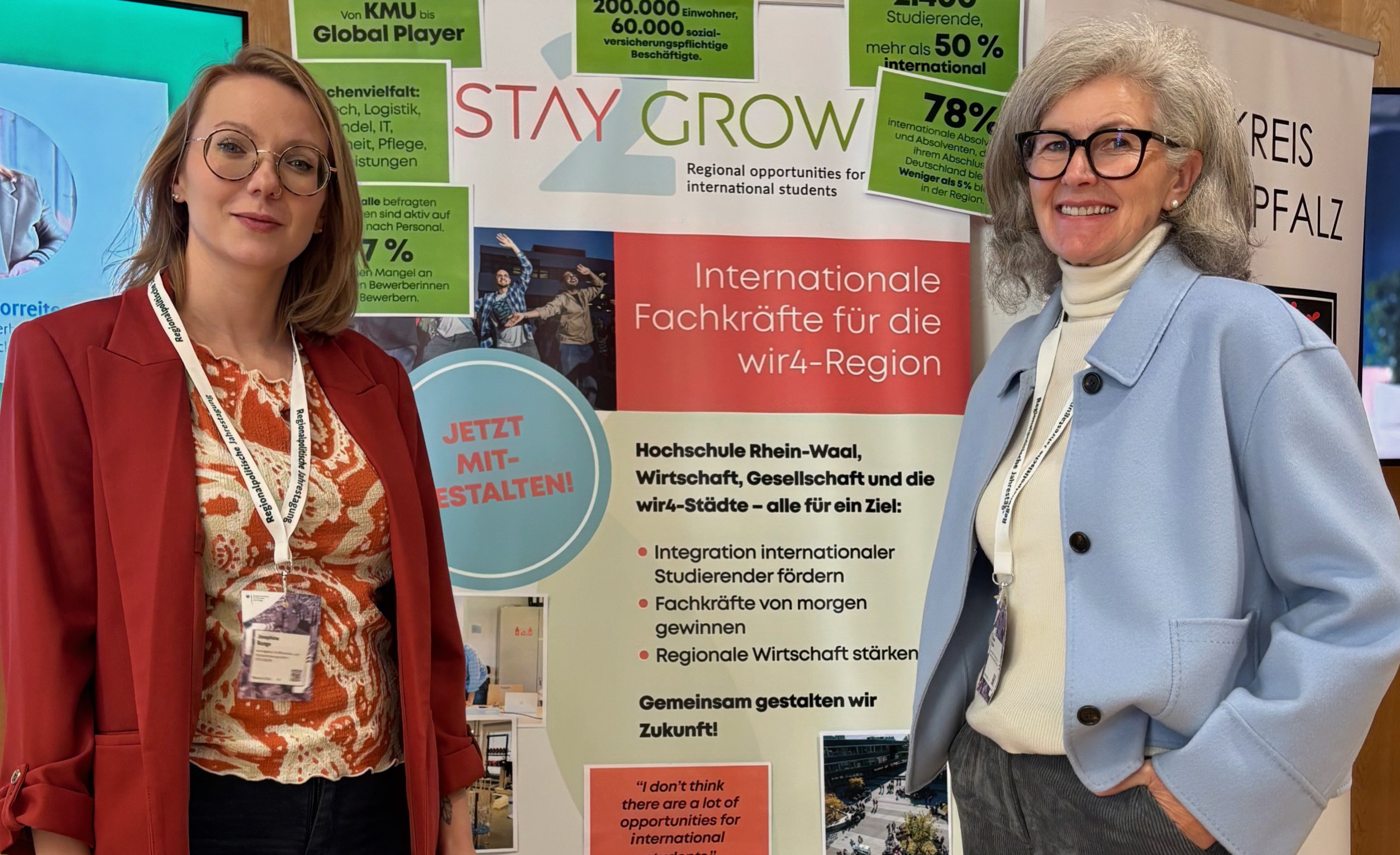 Der Mangel an Fachkräften ist eine zentrale Herausforderung für die Unternehmen in der wir4-Region und dem Kreis Wesel. Gleichzeitig ist die Region ein attraktiver Studienstandort, der viele internationale Talente anzieht. An der Hochschule Rhein-Waal werden sie in zukunftsweisenden Studiengängen ausgebildet. Diese hochqualifizierten Fachkräfte in der Region zu halten ist das Ziel des Förderprojekts STAY2GROW – denn bisher verlassen sie die Region nach ihrem Abschluss überwiegend.